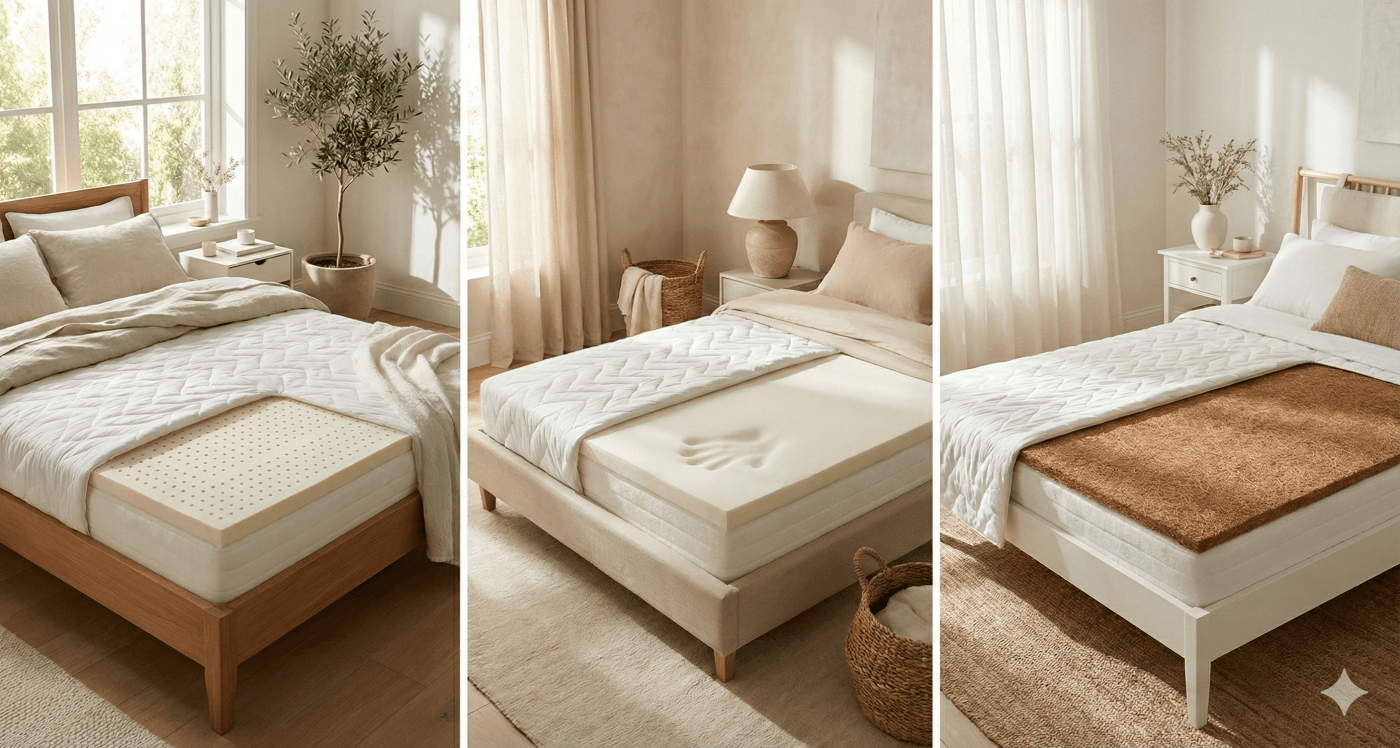 | Priporočljivo za | Pretrda ležišča, bolečine v sklepih/bokih, nemiren spanec | Mehčanje ležišč, alergike, tiste, ki jim je spominska pena prevroča | Utrditev premehkih ležišč, težave s hrbtenico, spanje na hrbtu |