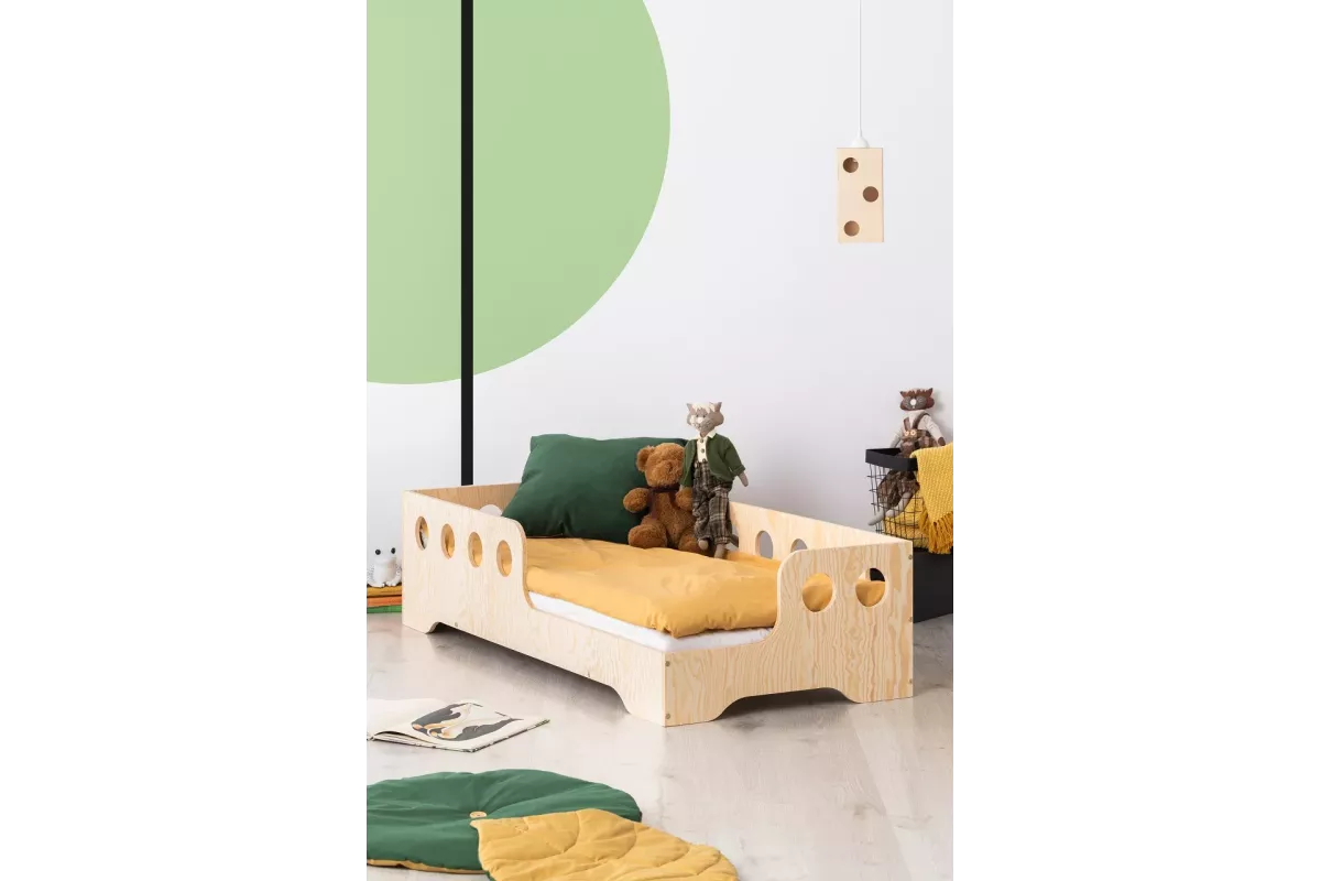 Ta postelja ni le prostor za spanje, temveč tudi prostor, ki razvija otroško domišljijo. Preprost, a eleganten dizajn spodbuja igro in počitek, njena nizka konstrukcija pa omogoča enostavno vstopanje in izstopanje tudi najmlajšim. Zahvaljujoč uporabi naravnih materialov je postelja okolju prijazna in varna za otroka, kar jo naredi za odlično izbiro za vsakega starša.