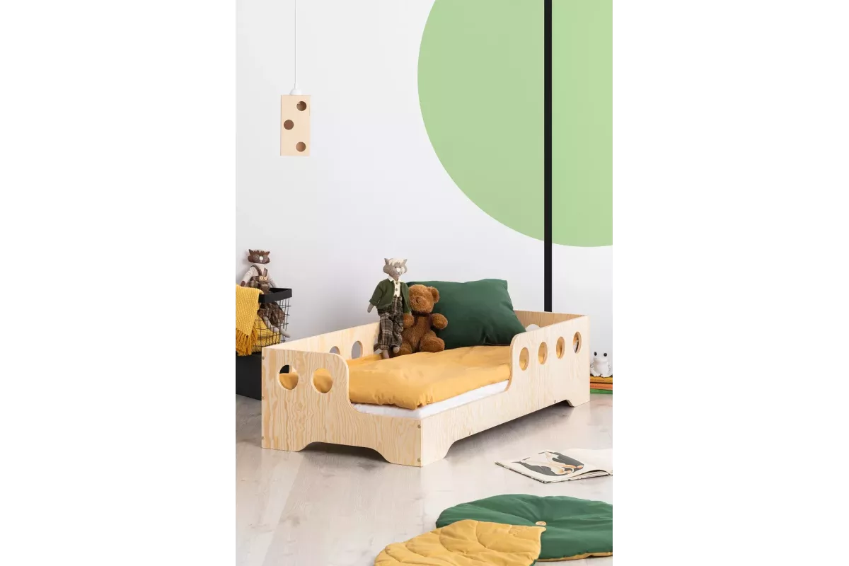 Ta postelja ni le prostor za spanje, temveč tudi prostor, ki razvija otroško domišljijo. Preprost, a eleganten dizajn spodbuja igro in počitek, njena nizka konstrukcija pa omogoča enostavno vstopanje in izstopanje tudi najmlajšim. Zahvaljujoč uporabi naravnih materialov je postelja okolju prijazna in varna za otroka, kar jo naredi za odlično izbiro za vsakega starša.